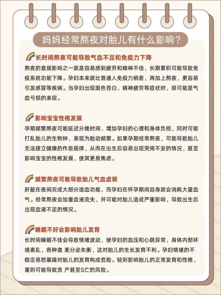胎宝的“熬夜反应”分阶段上演,孕早期(1-12周):胎宝的深度睡眠期,这时候的胎宝还是个小豆丁,每天90%的时间都在呼呼大睡。即使妈妈熬夜追剧到凌晨,胎宝也像被按了暂停键的玩偶,对外界刺激毫无反应。不过妈妈可别得意——熬夜引发的激素波动(如皮质醇升高)会通过胎盘影响胚胎发育,增加流产风险。就像给种子浇错了水,虽然现在看不出问题,但可能埋下隐患。孕中期(13-27周):胎宝的觉醒时刻,到了20周左右,胎宝开始能感知光线变化;26周后,他们甚至能跟着妈妈的作息形成初步睡眠周期。当妈妈熬夜时,胎宝可能经历这些奇妙体验:妈妈久坐不动→胎盘血流减少→胎宝通过减少胎动省电,妈妈吃夜宵→血糖飙升→胎宝兴奋地踢腿(就像我们喝奶茶后手舞足蹈),妈妈刷手机→蓝光抑制褪黑素→胎宝也跟着失眠,超声检查显示:熬夜妈妈的胎宝,活动频率比规律作息的胎宝低30%,就像被按了慢放键。孕晚期(28周后):胎宝的生物钟大战,这时候的胎宝已经是个“小大人”,能分辨昼夜了。当妈妈凌晨两点还在刷短视频,胎宝可能被妈妈的心跳加速“吵醒”→开始踢肚子抗议,因为妈妈肾上腺素飙升,自己也跟着紧张胎动频繁,被手机蓝光干扰导致褪黑素分泌减少出生后容易昼夜颠倒。研究发现:孕晚期熬夜的妈妈,胎宝出生后出现肠绞痛、易激惹的概率增加42%,就像把宝宝的生物钟调成了混乱模式。